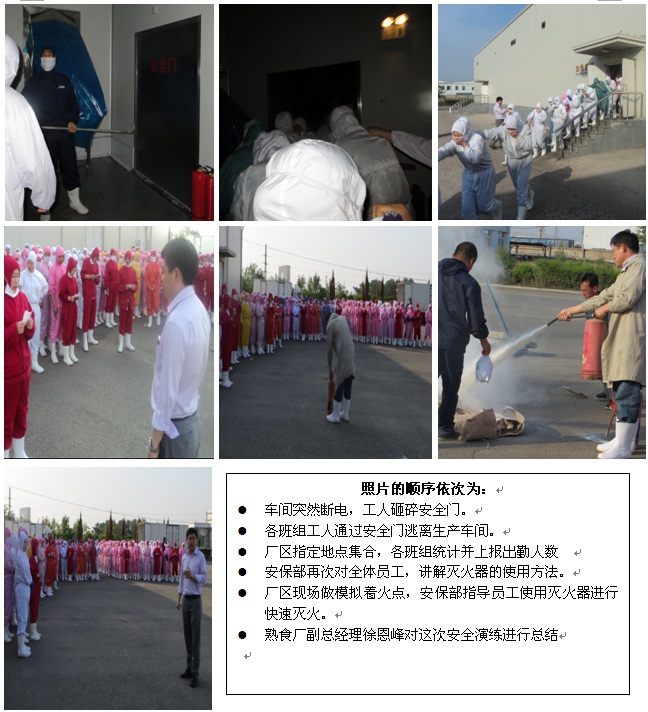 熟食二廠全體員工332人,于2013年06月16日16:40分,在熟食廠副總經(jīng)理徐恩峰、公司安保部劉龍軍的指揮下,進(jìn)行了一次以“緊急事故發(fā)生時(shí)熟悉疏散路線、提高疏散速度、減少人員傷害“為目的的模擬安全演練。